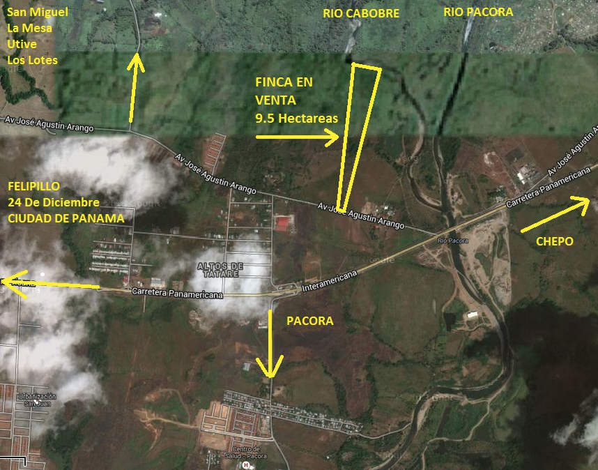 Frente a la Via Jose Agustin Arango y da hasta el Río Cabobre (afluente del Rio Pacora) en la parte de atrás.
