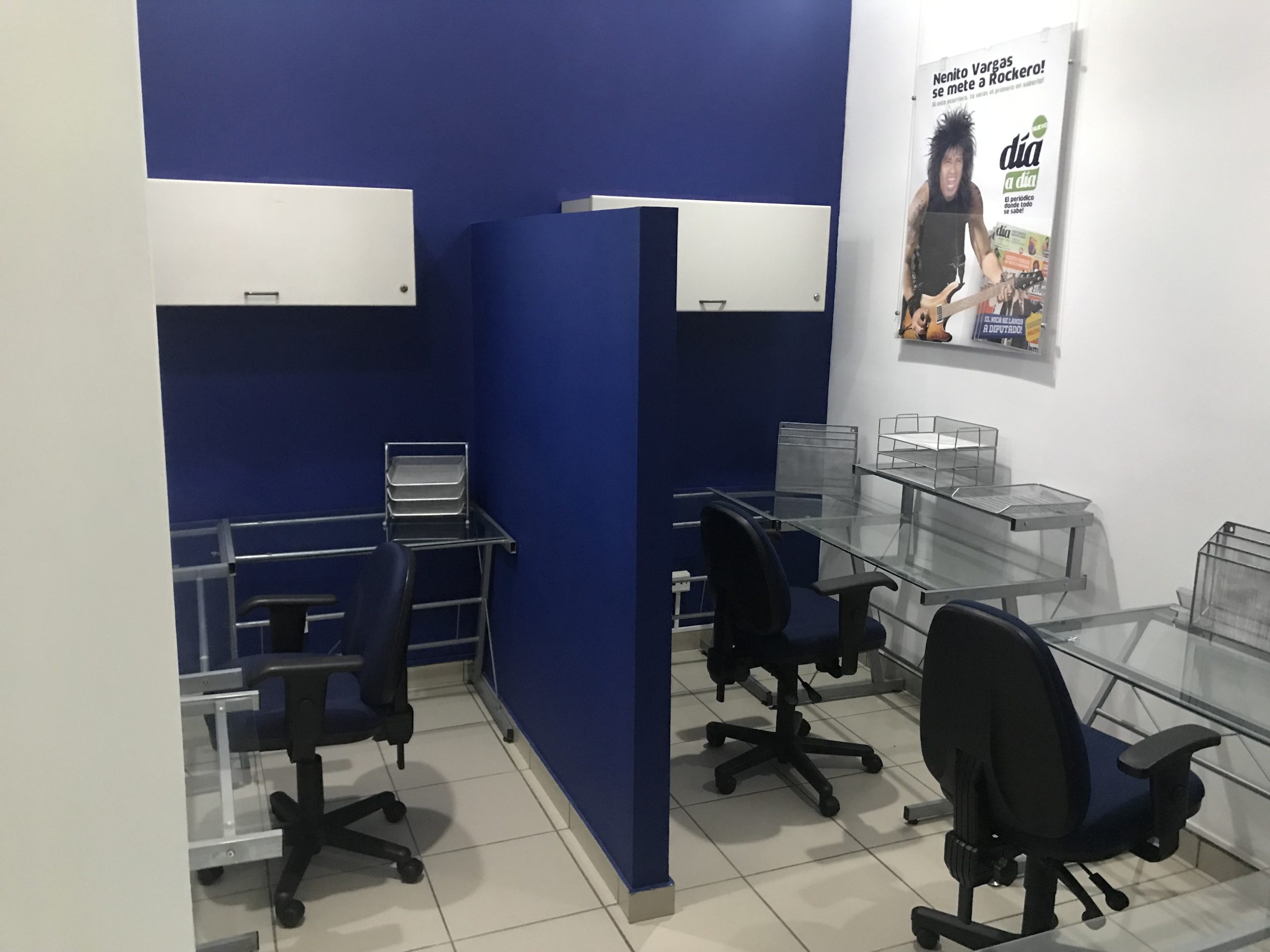 2 Cubículos /3-4 puestos de trabajo, escritorios de vidrio, 2 muebles aéreos con gran capacidad de almacenamiento